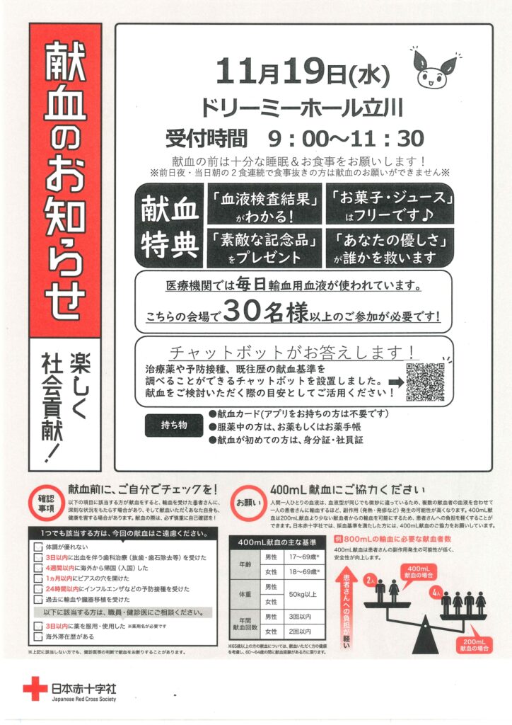 この度社会貢献の一環として、下記の日時で団体献血を行います。